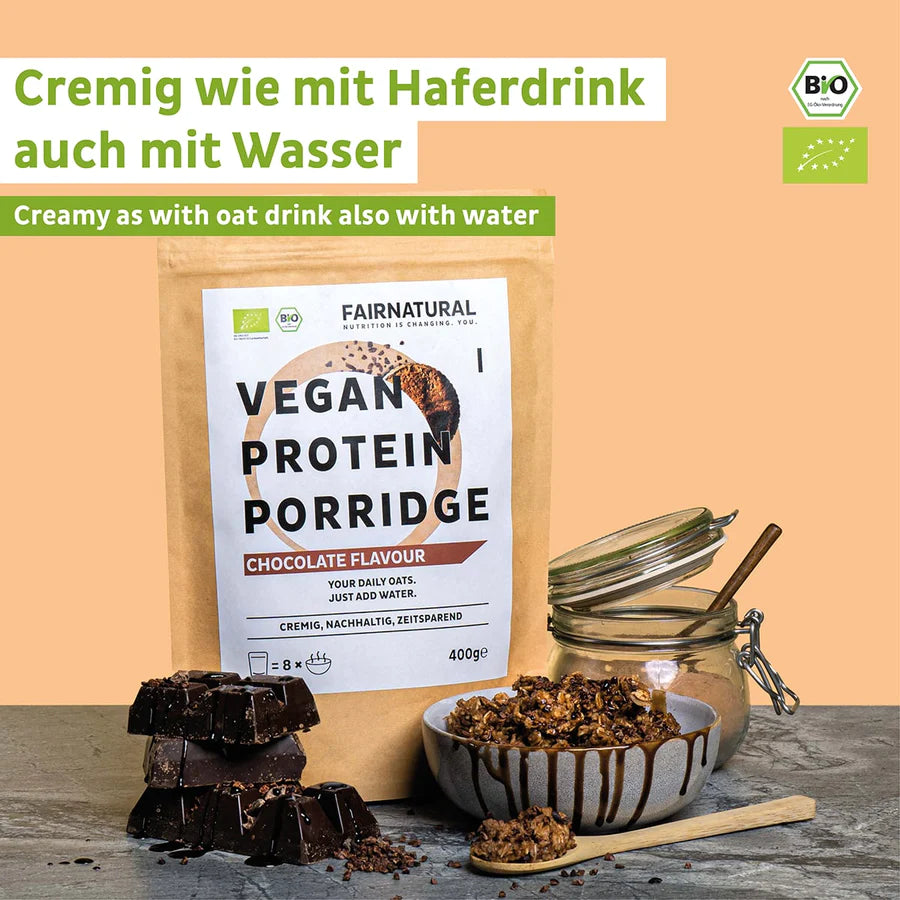 Notre porridge protéiné végétalien se distingue à la fois par sa consistance et par son goût exceptionnellement délicieux, avec de délicieuses pépites de chocolat bio.